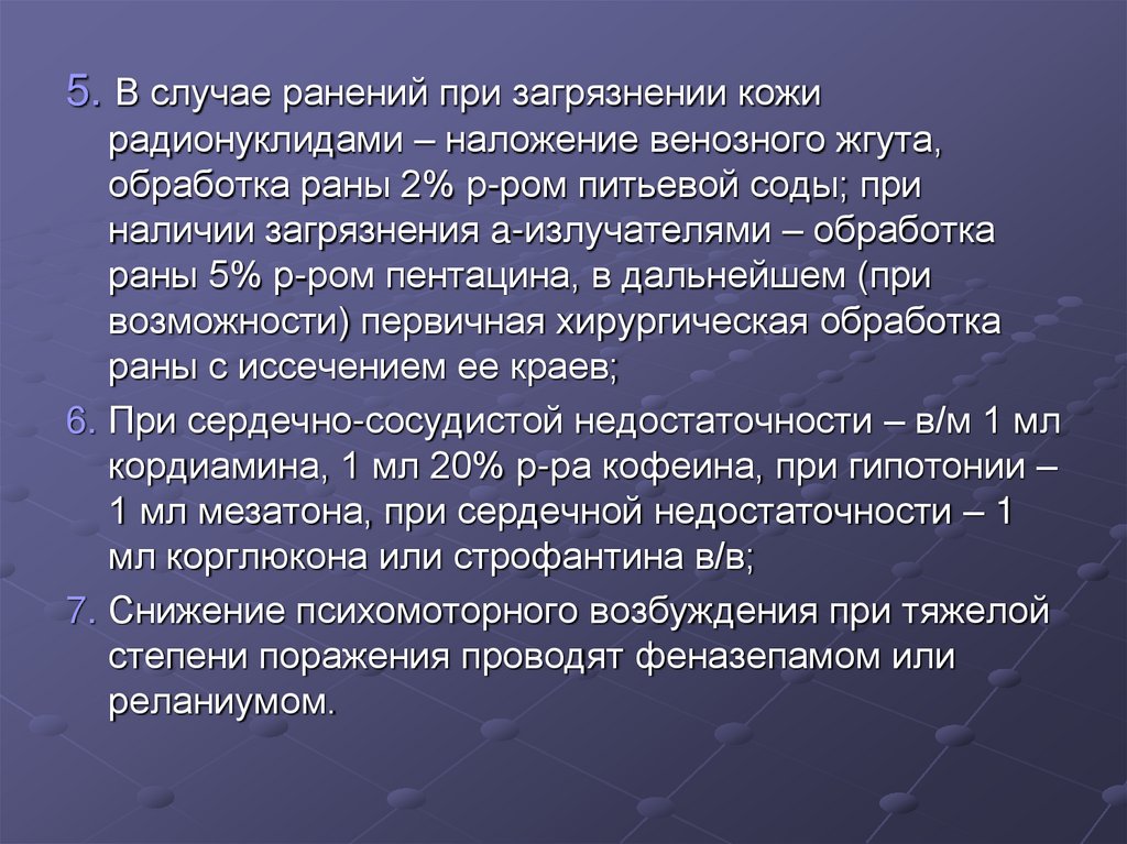 5. В случае ранений при загрязнении кожирадионуклидами – наложение венозного жгута,