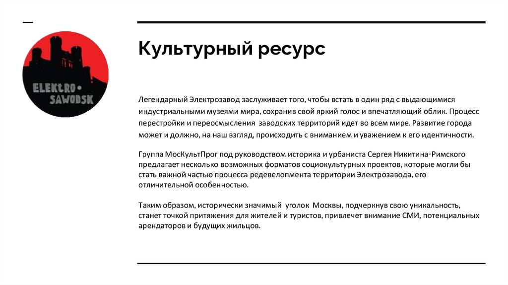 Культурный ресурсЛегендарный Электрозавод заслуживает того, чтобы встать в один ряд с выдающимися