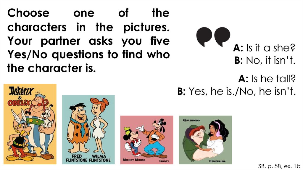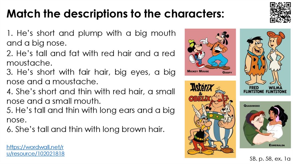 Match the descriptions to the characters:1. He’s short and plump with a big mouth