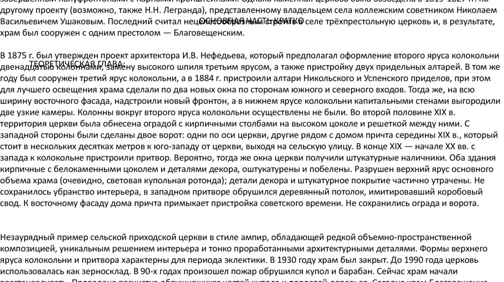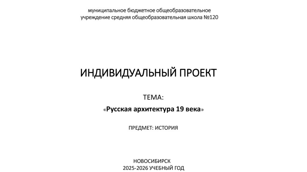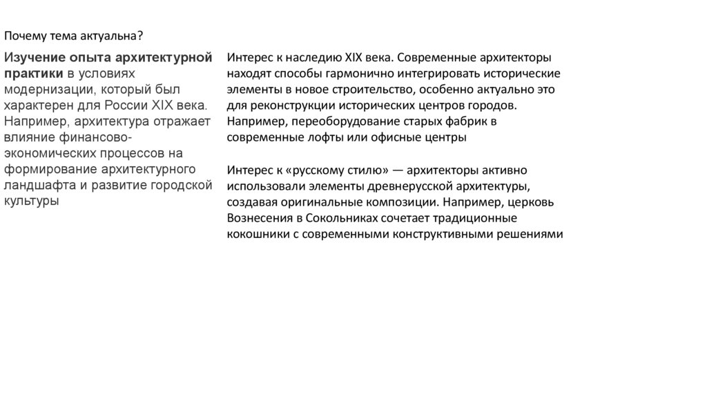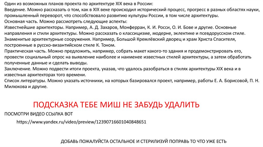 Один из возможных планов проекта по архитектуре XIX века в России:Введение. Можно рассказать о том, как в XIX веке происходил исторический процесс, прогресс в разных областях науки,