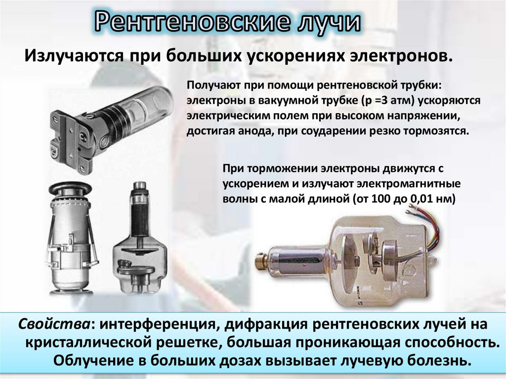Излучаются при больших ускорениях электронов.Получают при помощи рентгеновской трубки: