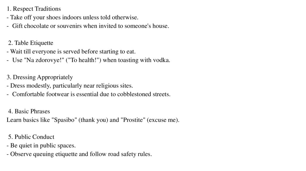 Learn basics like "Spasibo" (thank you) and "Prostite" (excuse me).