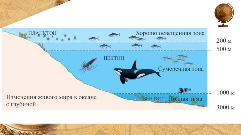 Большая часть живых организмов обитает в верхнем 200метровом слое воды, куда проникает солнечный свет. Где