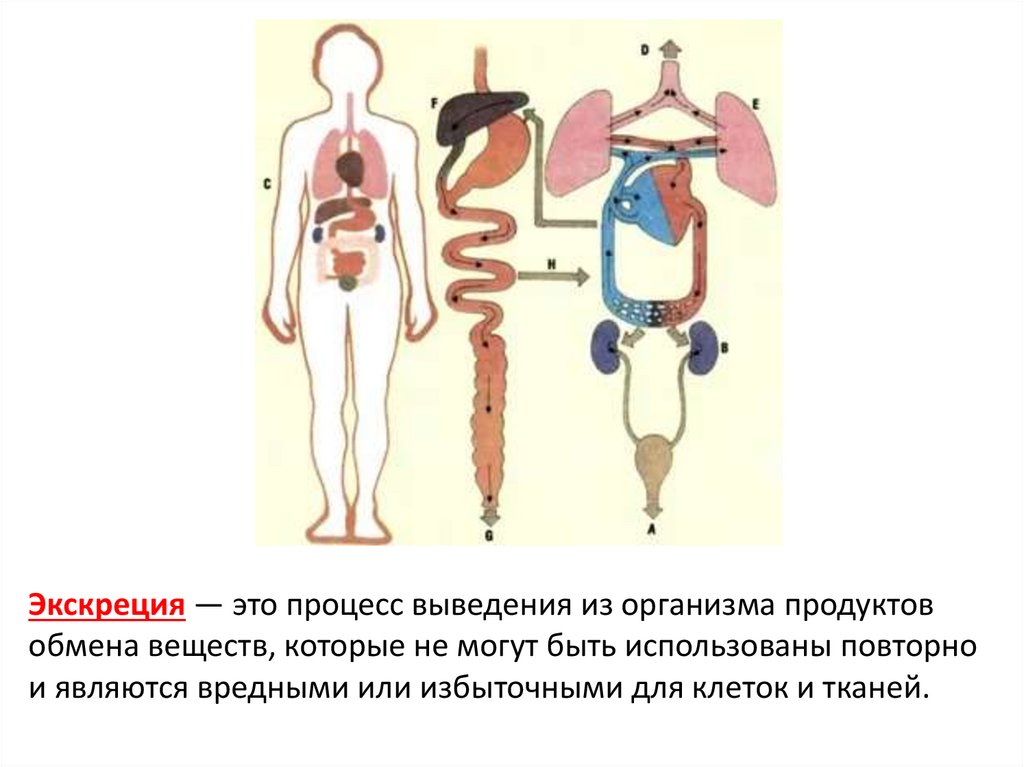 Экскреция — это процесс выведения из организма продуктовобмена веществ, которые не могут быть использованы повторно