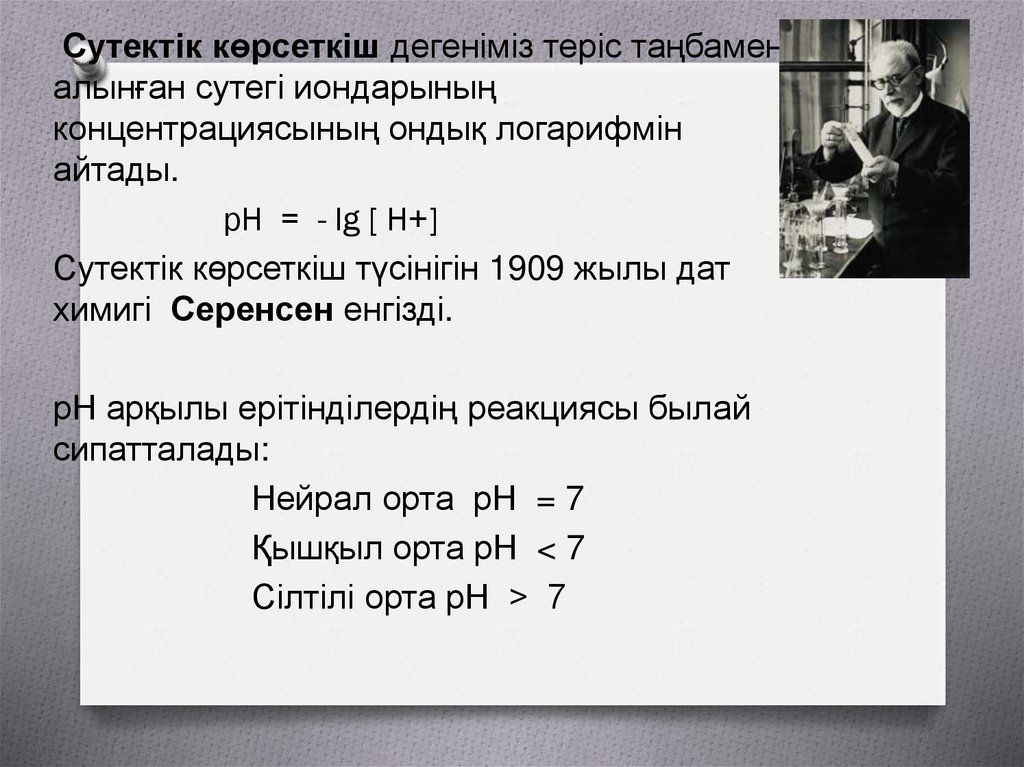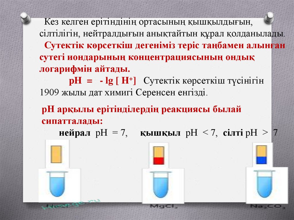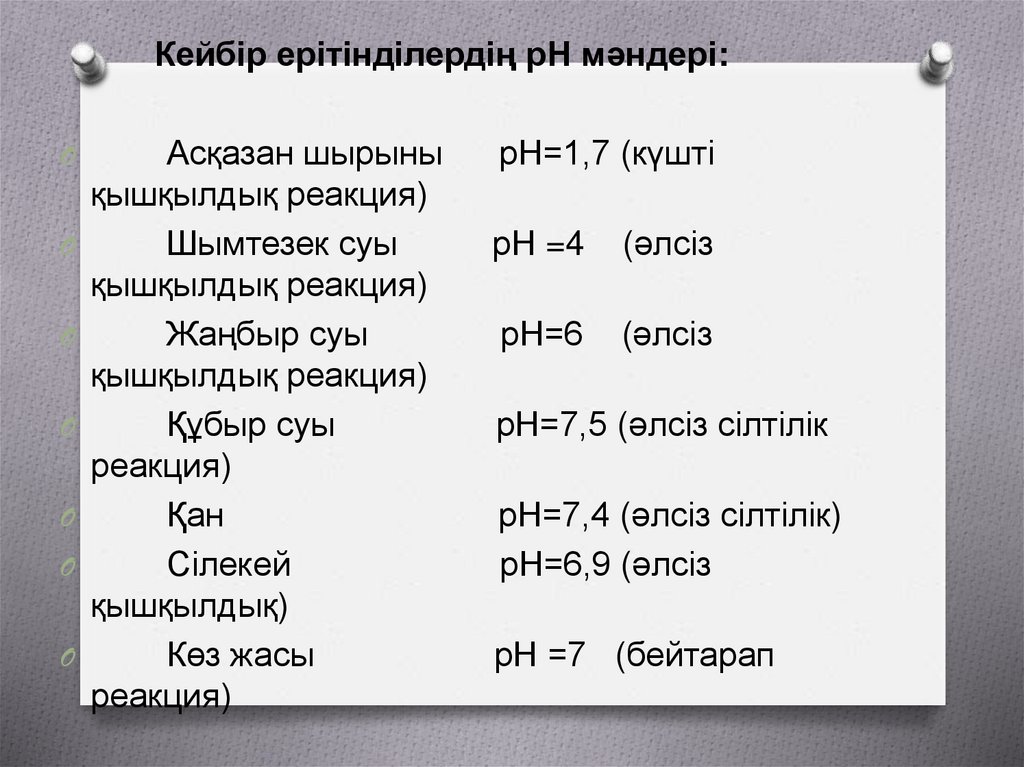 нейрал рН = 7, қышқыл рН < 7, сілті рН > 7