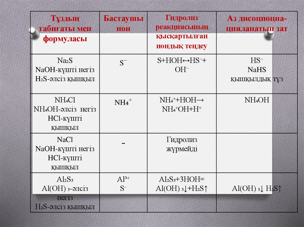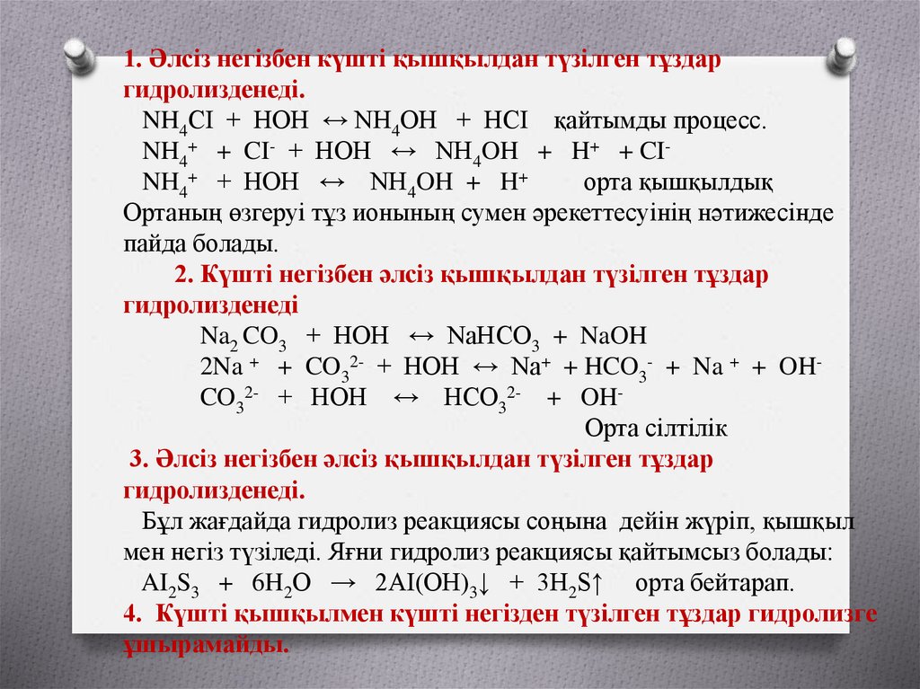 NH4CI + HOH ↔ NH4OH + HCI қайтымды процесс.
