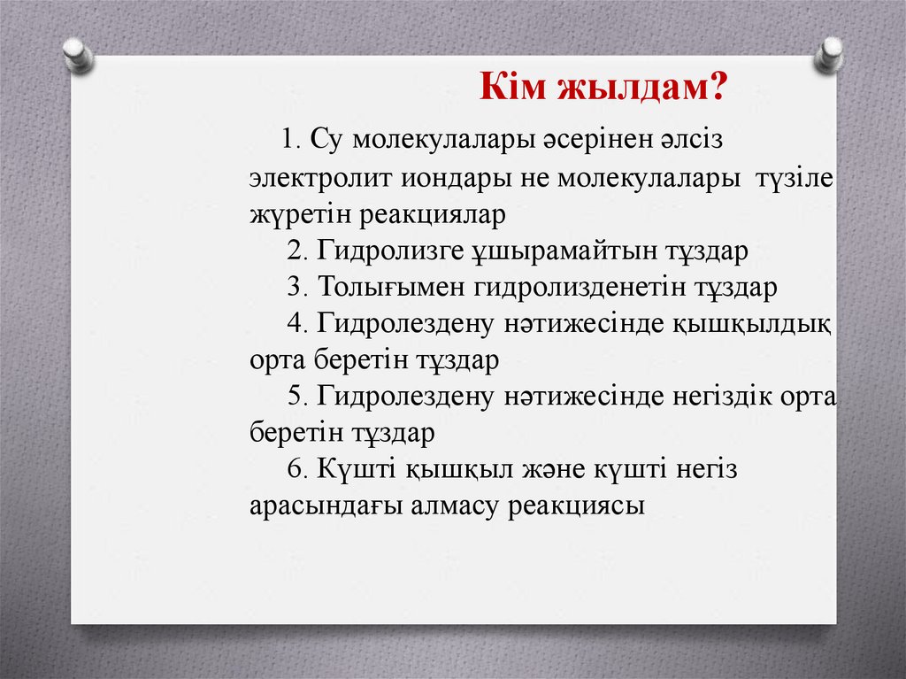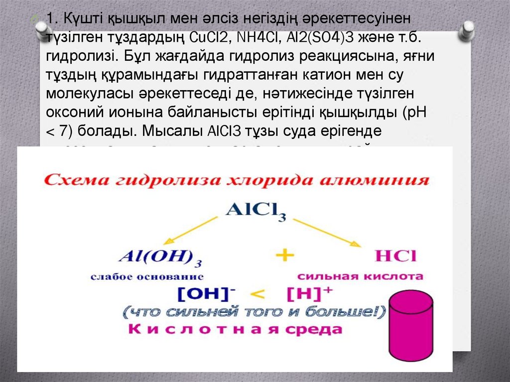 O 1. Күшті қышқыл мен әлсіз негіздің әрекеттесуінентүзілген тұздардың CuCl2, NH4Cl, Al2(SO4)3 және т.б.