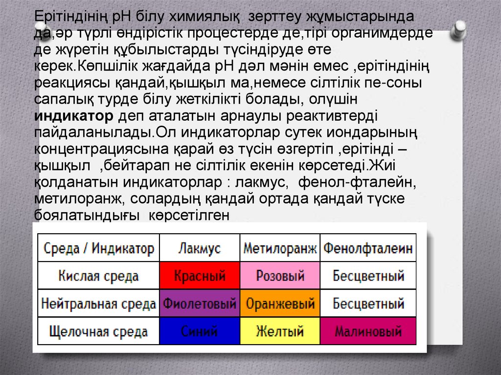 Кез келген ерітіндінің ортасының қышқылдығын,сілтілігін, нейтралдығын анықтайтын құрал қолданылады.