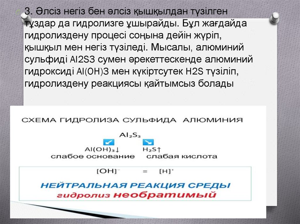 AI2S3 + 6H2O → 2AI(OH)3↓ + 3H2S↑ орта бейтарап.