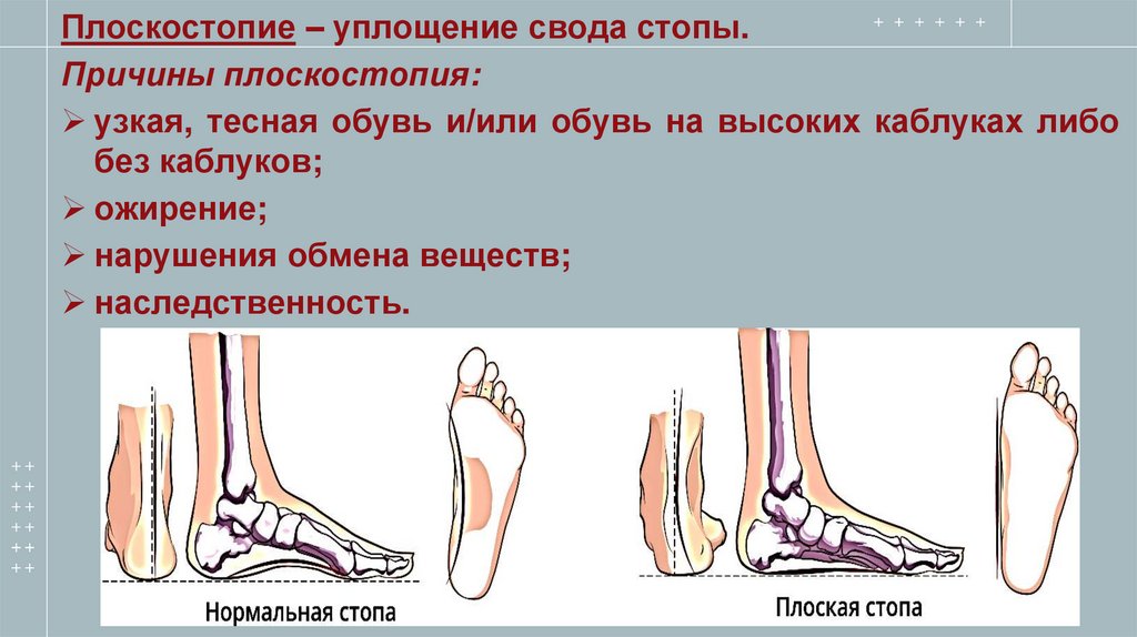 Плоскостопие – уплощение свода стопы.Причины плоскостопия: