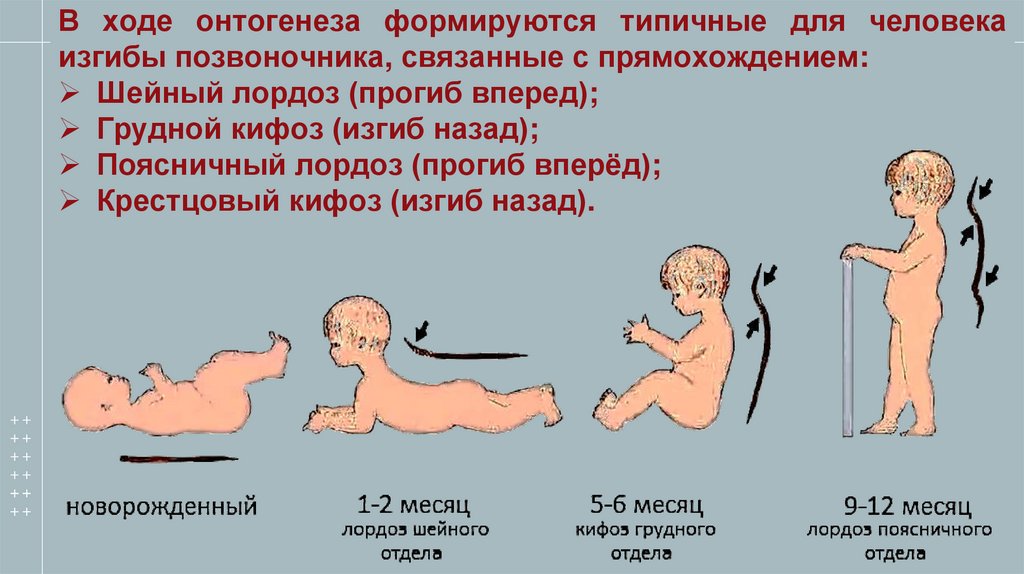 В ходе онтогенеза формируются типичные для человекаизгибы позвоночника, связанные с прямохождением: