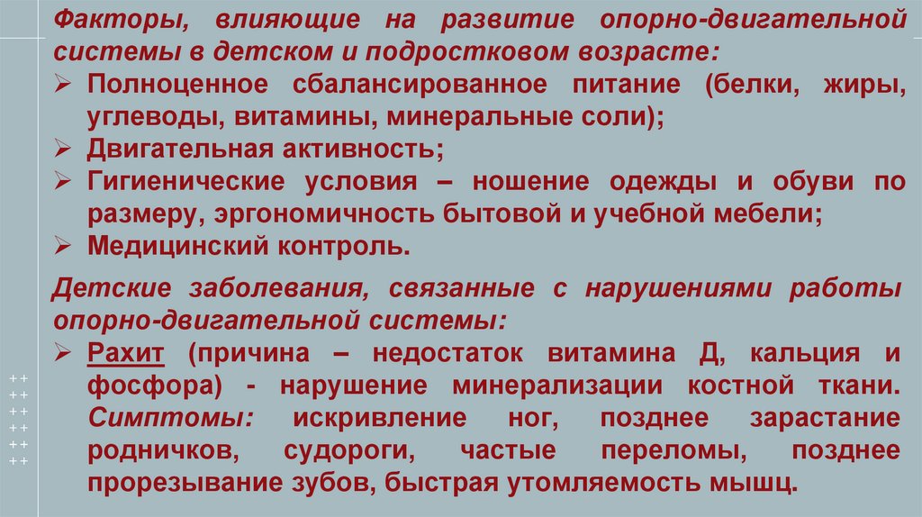 Факторы, влияющие на развитие опорно-двигательнойсистемы в детском и подростковом возрасте: