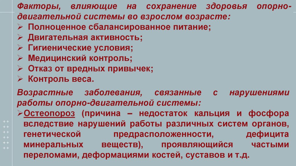 Факторы, влияющие на сохранение здоровьядвигательной системы во взрослом возрасте: