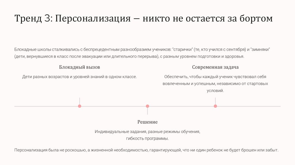 Тренд 3: Персонализация — никто не остается за бортомБлокадные школы сталкивались с беспрецедентным разнообразием учеников: "старички" (те, кто учился с сентября) и "зимняки"