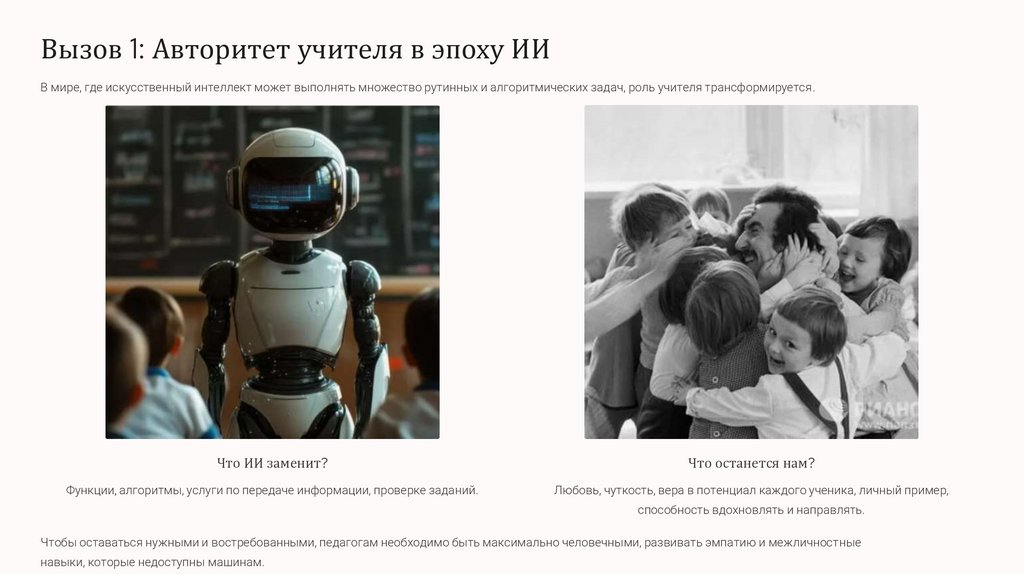 Вызов 1: Авторитет учителя в эпоху ИИВ мире, где искусственный интеллект может выполнять множество рутинных и алгоритмических задач, роль учителя трансформируется.