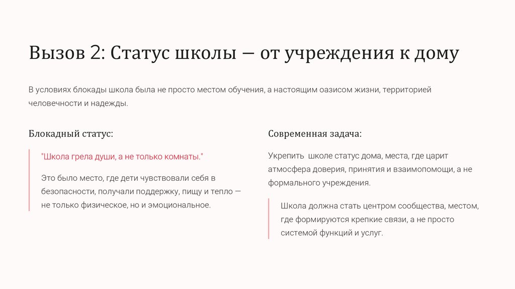 Вызов 2: Статус школы — от учреждения к домуВ условиях блокады школа была не просто местом обучения, а настоящим оазисом жизни, территорией
