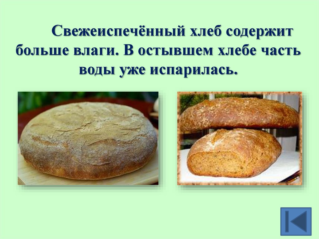 Свежеиспечённый хлеб содержитбольше влаги. В остывшем хлебе часть