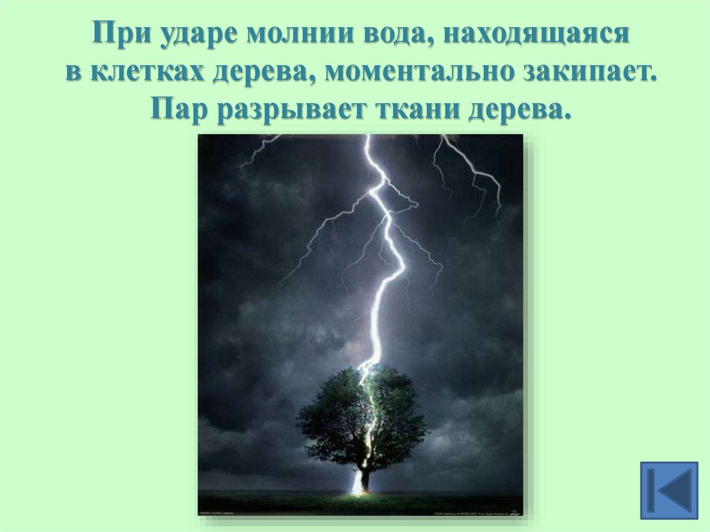 При ударе молнии вода, находящаясяв клетках дерева, моментально закипает.