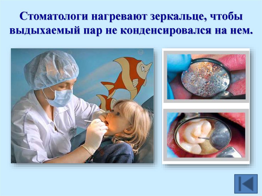 Стоматологи нагревают зеркальце, чтобывыдыхаемый пар не конденсировался на нем.