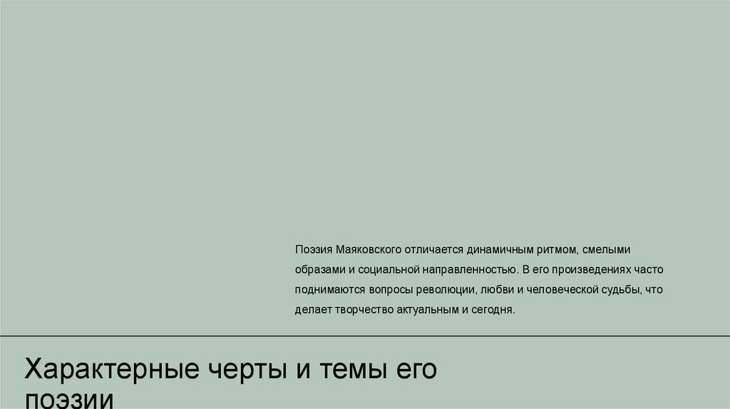 Поэзия Маяковского отличается динамичным ритмом, смелымиобразами и социальной направленностью. В его произведениях часто