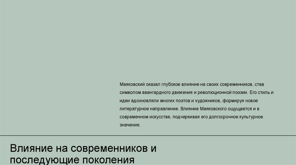 Маяковский оказал глубокое влияние на своих современников, ставсимволом авангардного движения и революционной поэзии. Его стиль и