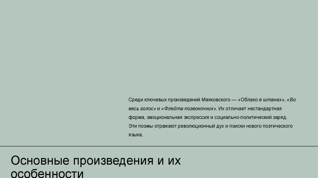 Среди ключевых произведений Маяковского — «Облако в штанах», «Вовесь голос» и «Флейта-позвоночник». Их отличает нестандартная