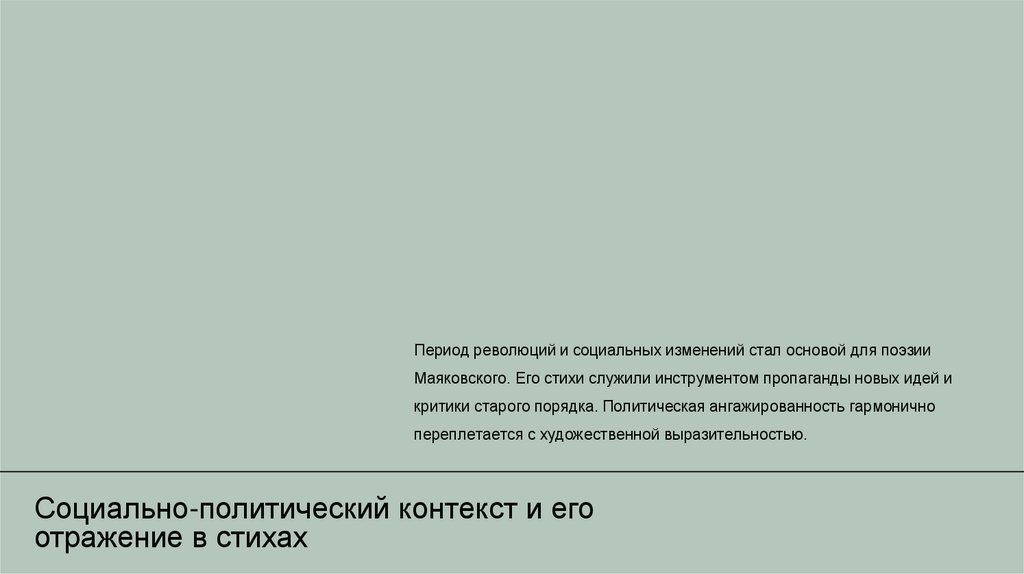Период революций и социальных изменений стал основой для поэзииМаяковского. Его стихи служили инструментом пропаганды новых идей и