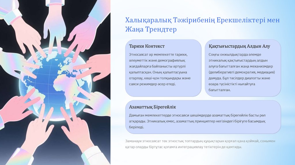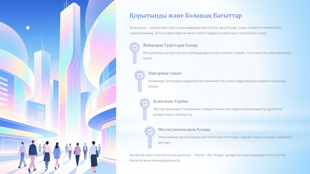 Қорытынды және Болашақ БағыттарЭтносаясат – қазіргі көпэтносты қоғамдардың өзегі болып қала береді. Оның тиімділігі мемлекеттің