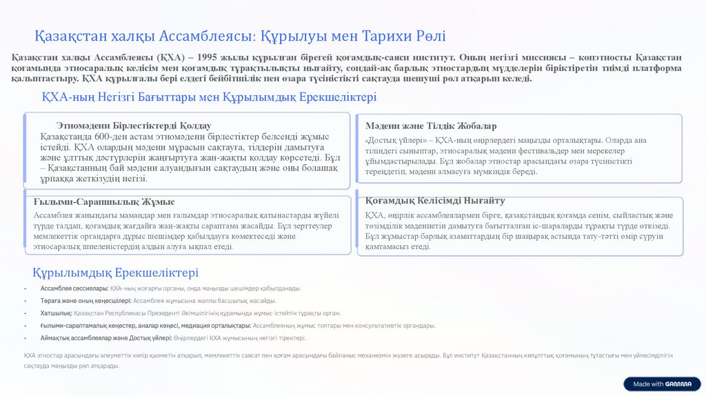 Қазақстан халқы Ассамблеясы: Құрылуы мен Тарихи РөліҚазақстан халқы Ассамблеясы (ҚХА) – 1995 жылы құрылған бірегей қоғамдық-саяси институт. Оның негізгі миссиясы – көпэтносты Қазақстан