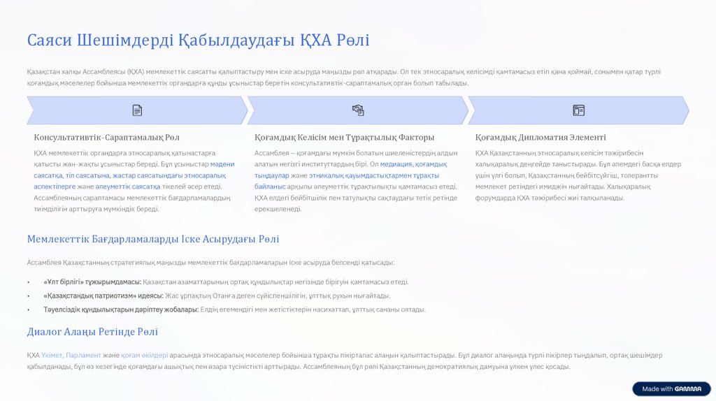Саяси Шешімдерді Қабылдаудағы ҚХА РөліҚазақстан халқы Ассамблеясы (ҚХА) мемлекеттік саясатты қалыптастыру мен іске асыруда маңызды рөл атқарады. Ол тек этносаралық келісімді қамтамасыз етіп қана қоймай, сонымен қатар түрлі