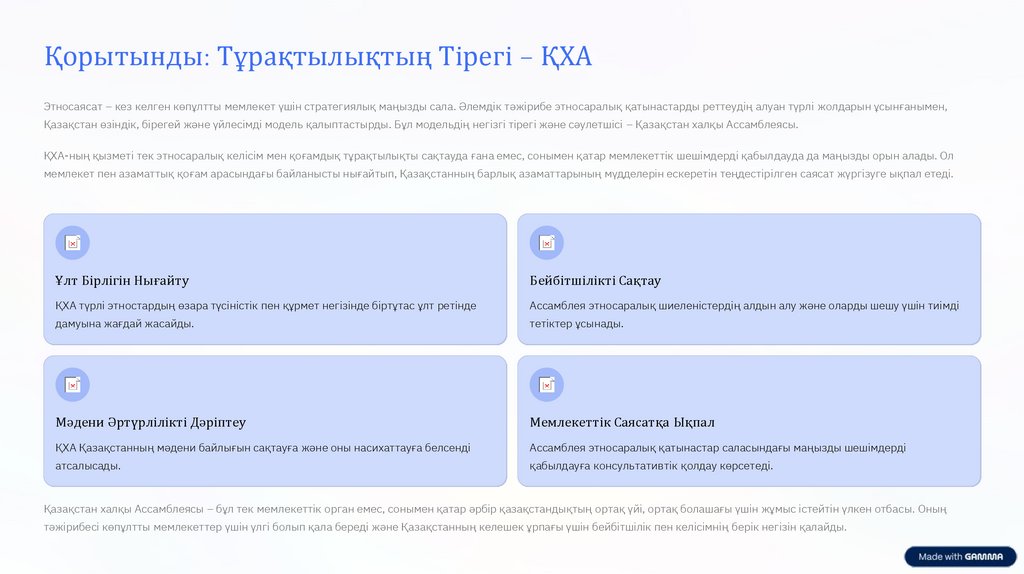 Қорытынды: Тұрақтылықтың Тірегі – ҚХАЭтносаясат – кез келген көпұлтты мемлекет үшін стратегиялық маңызды сала. Әлемдік тәжірибе этносаралық қатынастарды реттеудің алуан түрлі жолдарын ұсынғанымен,