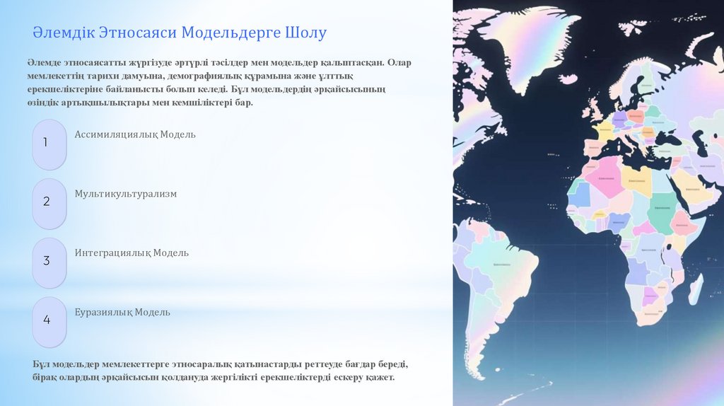 Әлемдік Этносаяси Модельдерге ШолуӘлемде этносаясатты жүргізуде әртүрлі тәсілдер мен модельдер қалыптасқан. Олар