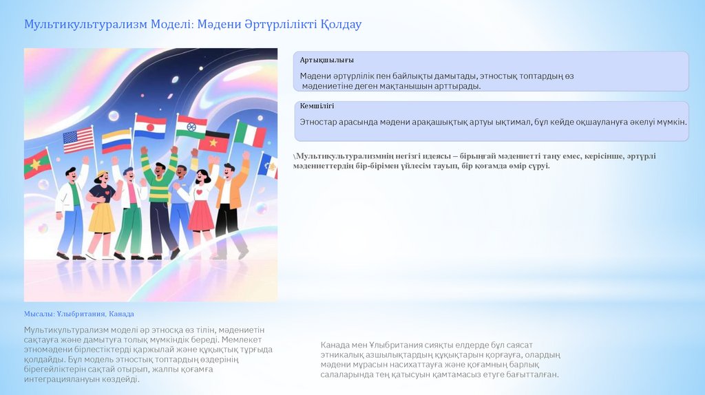 \ Мультикультурализмнің негізгі идеясы – бірыңғай мәдениетті таңу емес, керісінше, әртүрлі