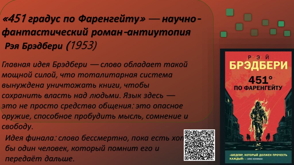 «451 градус по Фаренгейту» — научнофантастический роман-антиутопияРэя Брэдбери (1953)