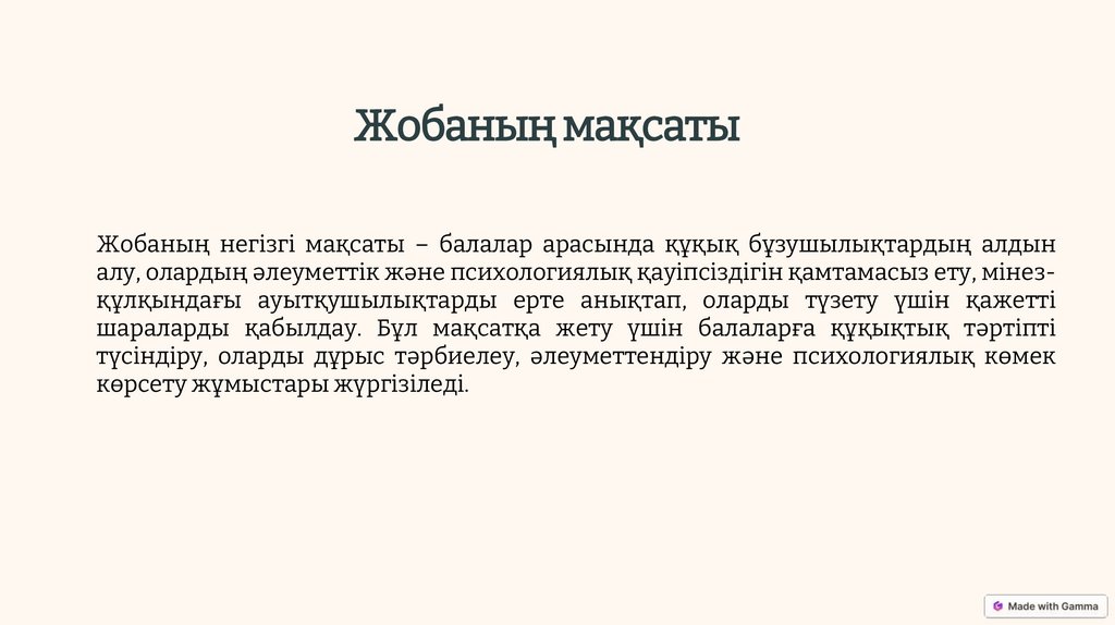 Жобаның мақсатыЖобаның негізгі мақсаты – балалар арасында құқық бұзушылықтардың алдын