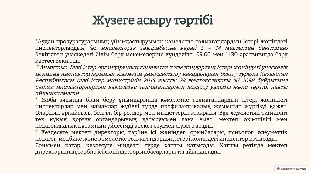 Жүзеге асыру тәртібі*Аудан прокуратурасының ұйымдастыруымен кәмелетке толмағандардың істері жөніндегі