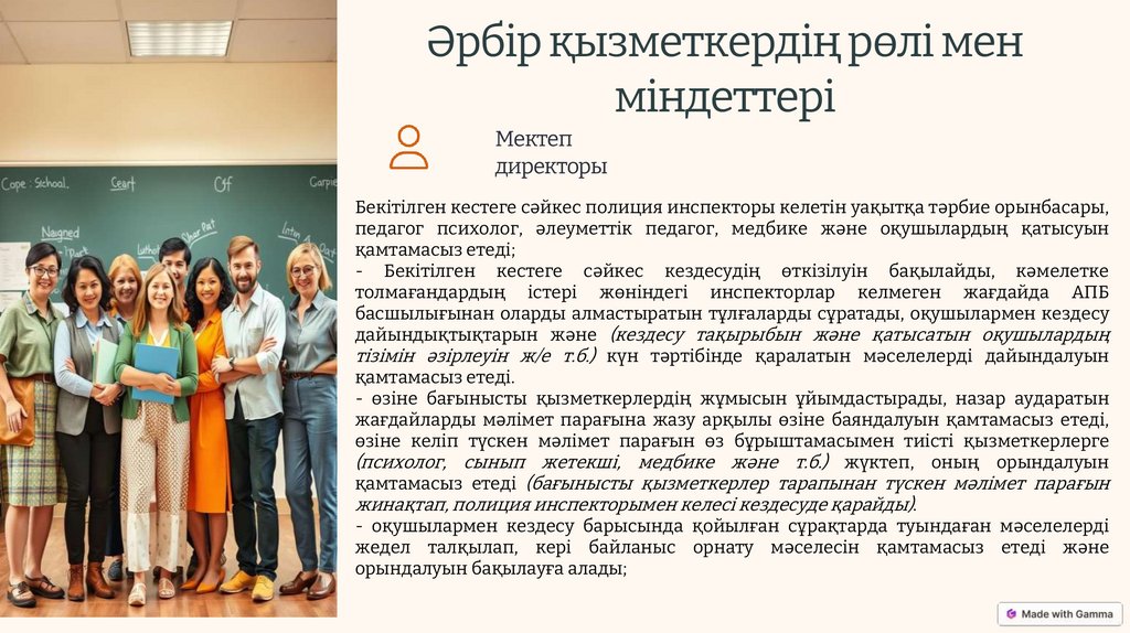Бекітілген кестеге сәйкес полиция инспекторы келетін уақытқа тәрбие орынбасары,