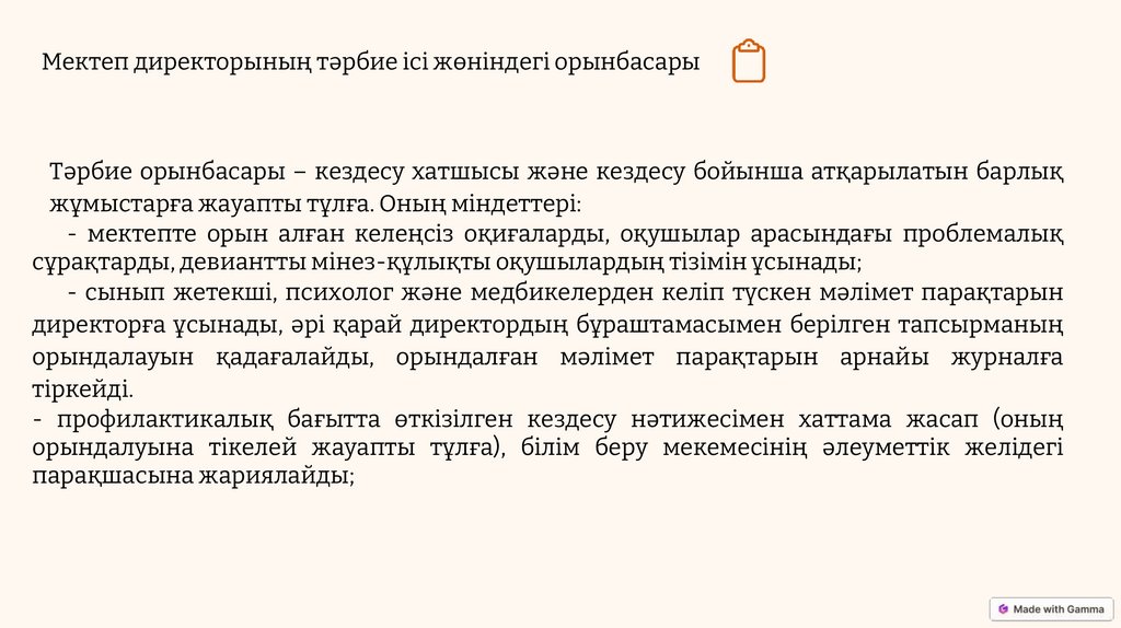 Мектеп директорының тәрбие ісі жөніндегі орынбасарыТәрбие орынбасары – кездесу хатшысы және кездесу бойынша атқарылатын барлық