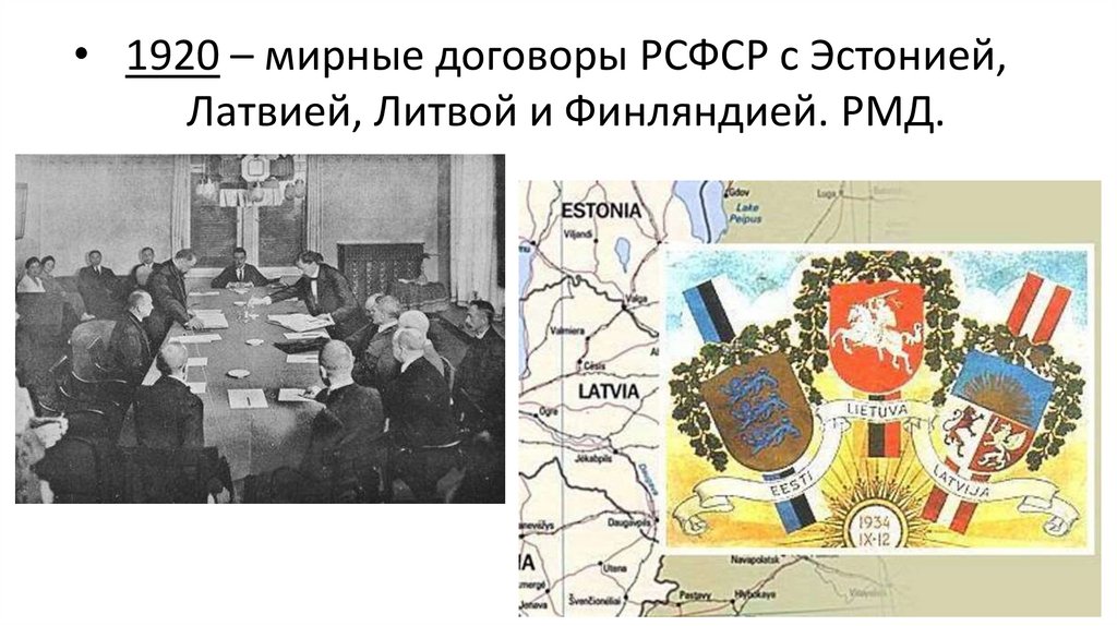 • 1920 – мирные договоры РСФСР с Эстонией,Латвией, Литвой и Финляндией. РМД.