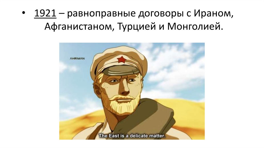 • 1921 – равноправные договоры с Ираном,Афганистаном, Турцией и Монголией.