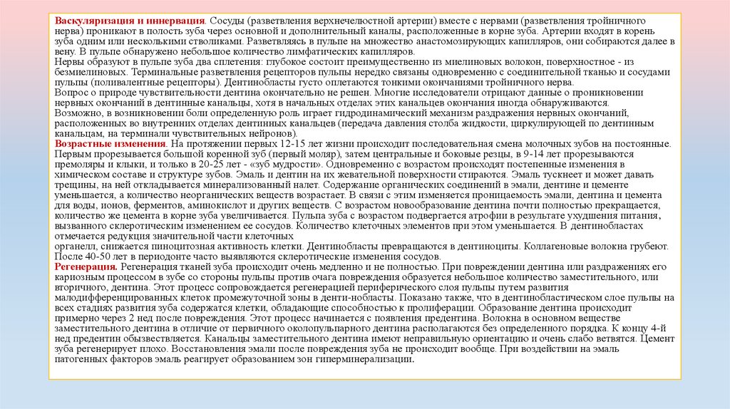 Васкуляризация и иннервация. Сосуды (разветвления верхнечелюстной артерии) вместе с нервами (разветвления тройничногонерва) проникают в полость зуба через основной и дополнительный каналы, расположенные в корне зуба. Артерии входят в корень