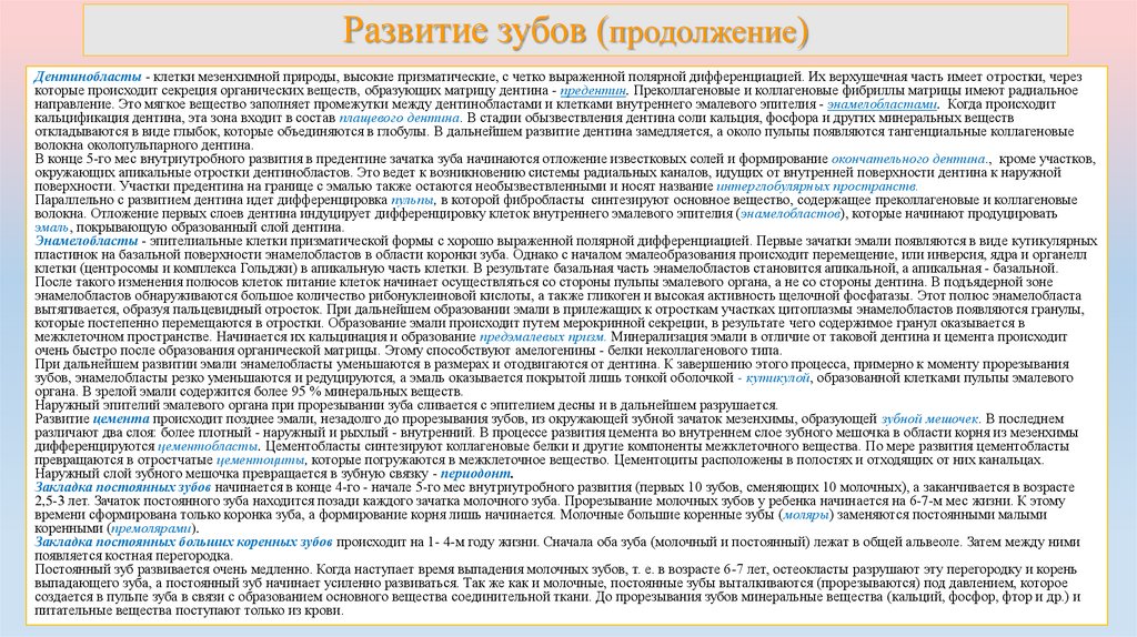 всех стадиях развития зуба содержатся клетки, обладающие способностью к пролиферации. Образование дентина происходит