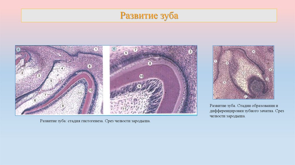 Развитие зуба: стадия гистогенеза. Срез челюсти зародыша.