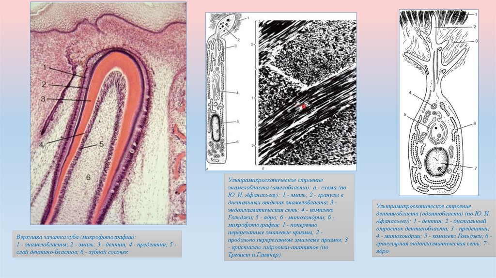 Верхушка зачатка зуба (микрофотография):1 - энамелобласты; 2 - эмаль; 3 - дентин; 4 - предентин; 5 слой дентино-бластов; 6 - зубной сосочек