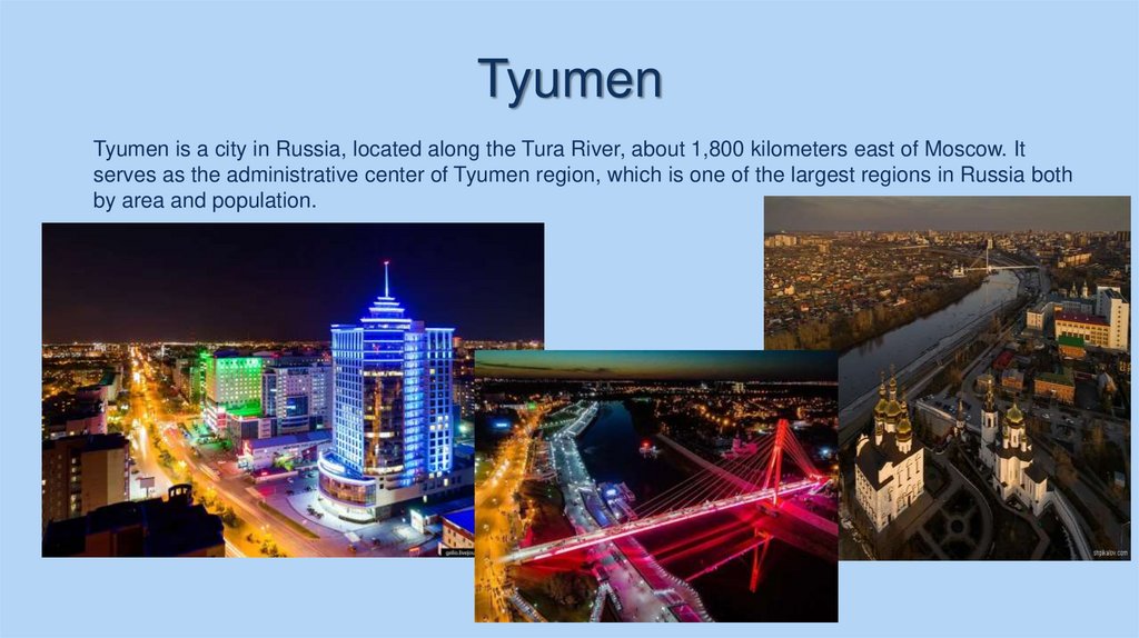 TyumenTyumen is a city in Russia, located along the Tura River, about 1,800 kilometers east of Moscow. It