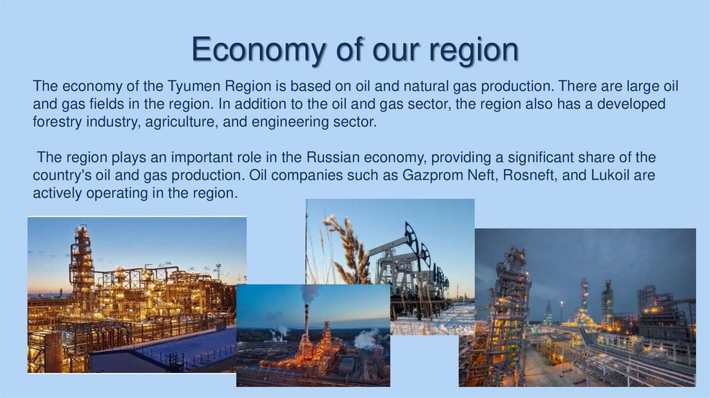 Economy of our regionThe economy of the Tyumen Region is based on oil and natural gas production. There are large oil
