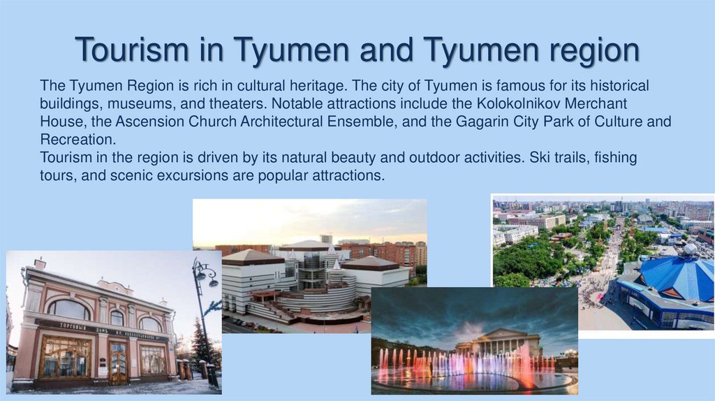 Tourism in Tyumen and Tyumen regionThe Tyumen Region is rich in cultural heritage. The city of Tyumen is famous for its historical