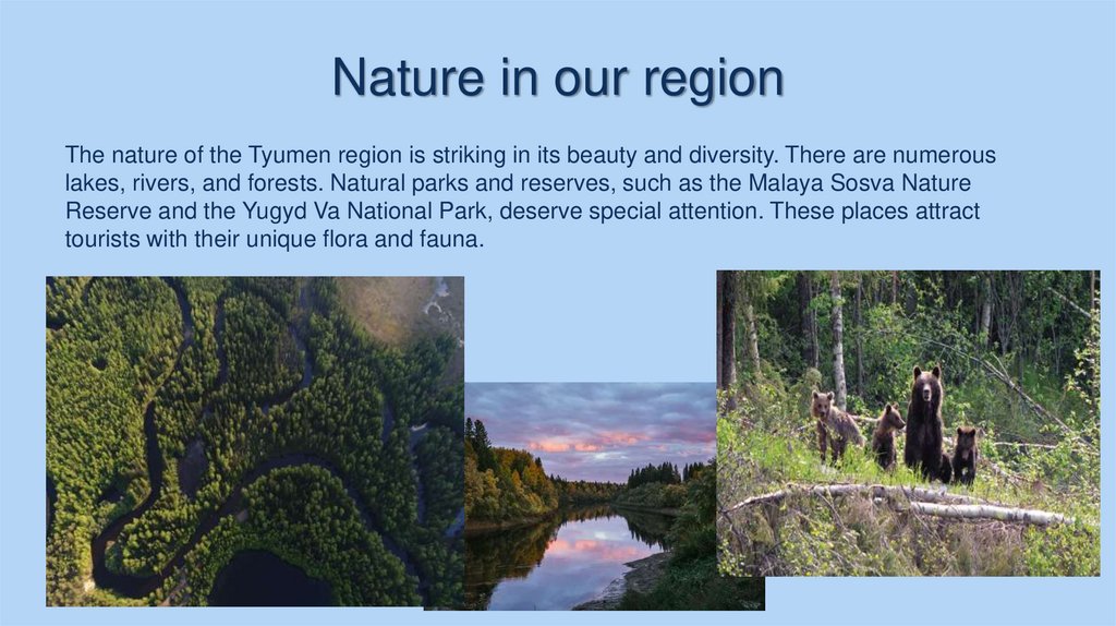 Nature in our regionThe nature of the Tyumen region is striking in its beauty and diversity. There are numerous