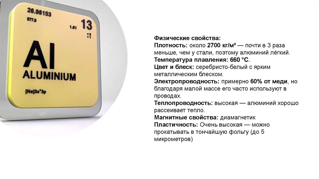 Физические свойства:Плотность: около 2700 кг/м³ — почти в 3 раза
