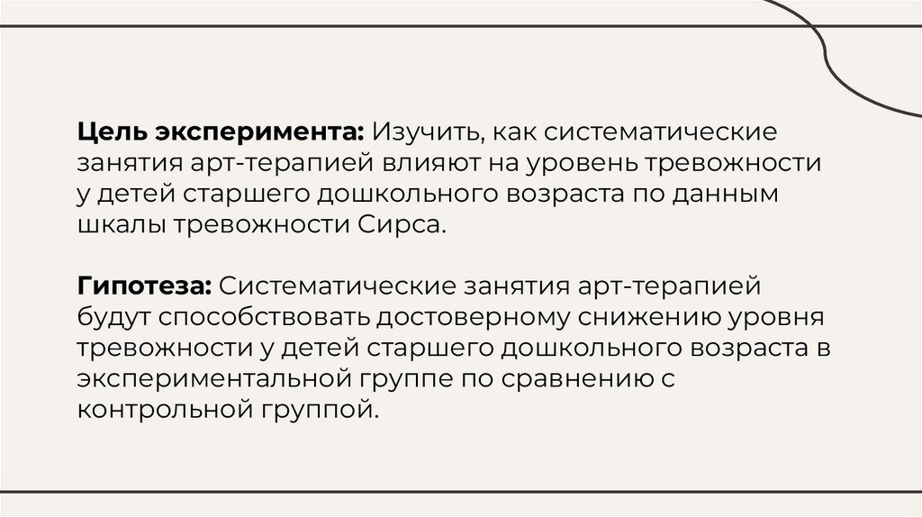 Цель эксперимента: Изучить, как систематическиезанятия арт-терапией влияют на уровень тревожности